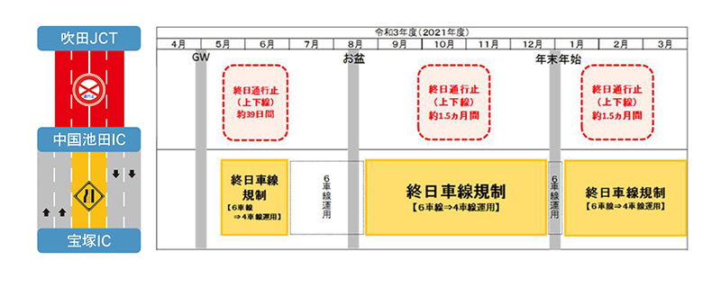 工事へのご理解・ご協力ありがとうございました。次回工事は、8月下旬より中国池田IC〜宝塚IC間で終日車線規制を予定しております。